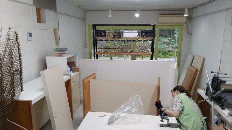 いそぎ早朝に出かけ、机をまず組み立ててスタンバイです。だいぶ工房らしくなってきました。